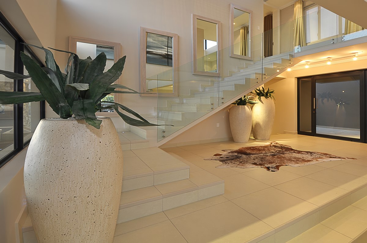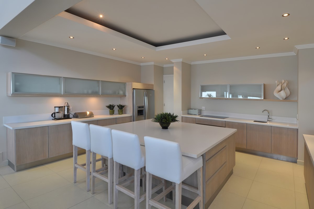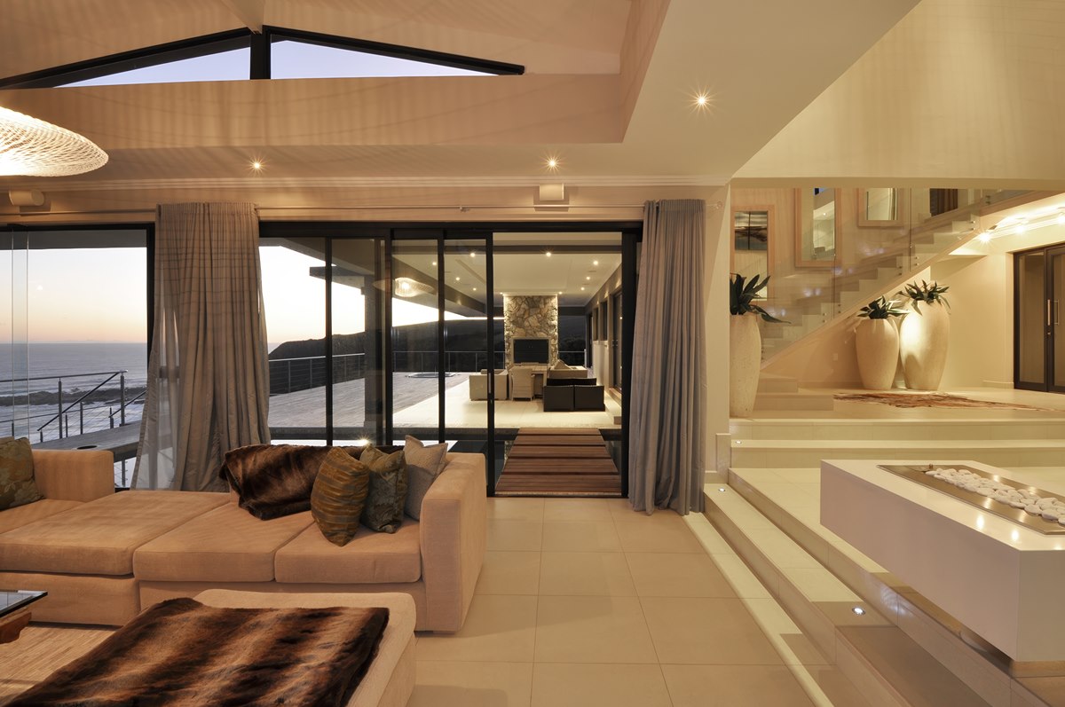 The upper level is dedicated to private spaces, comprising bedrooms and bathrooms positioned to maximize views. The lower-level plays host to the living spaces, designed to immerse the owners in the indigenous landscape while offering views of the ocean and the rocks extending beyond the iconic Knysna Heads.