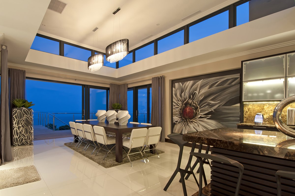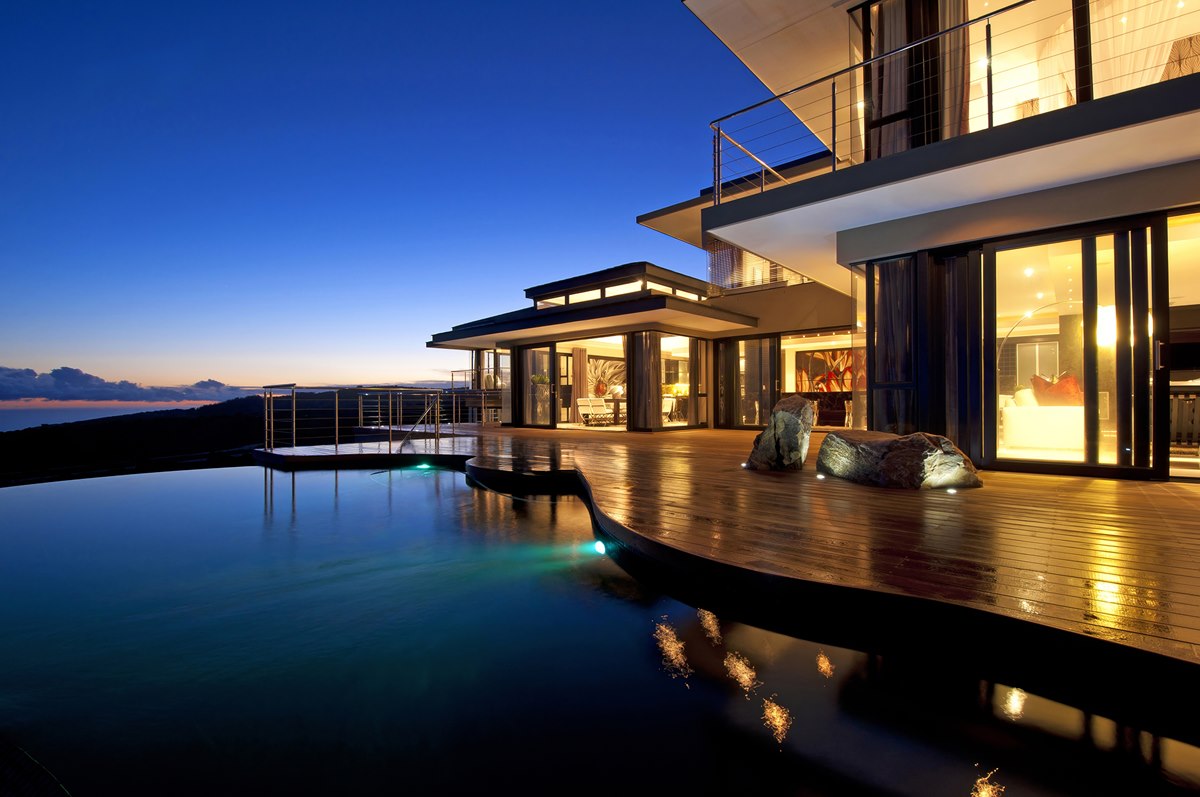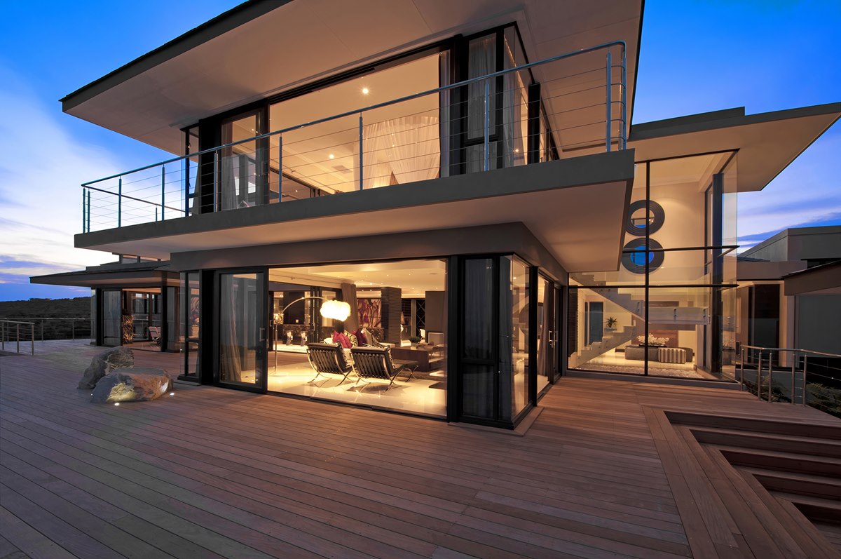 Perched on a rock outcrop within the Pezula Private Estate, overlooking the landscape of Knysna along The Garden Route in South Africa, this home commands attention as a beacon of architectural design.