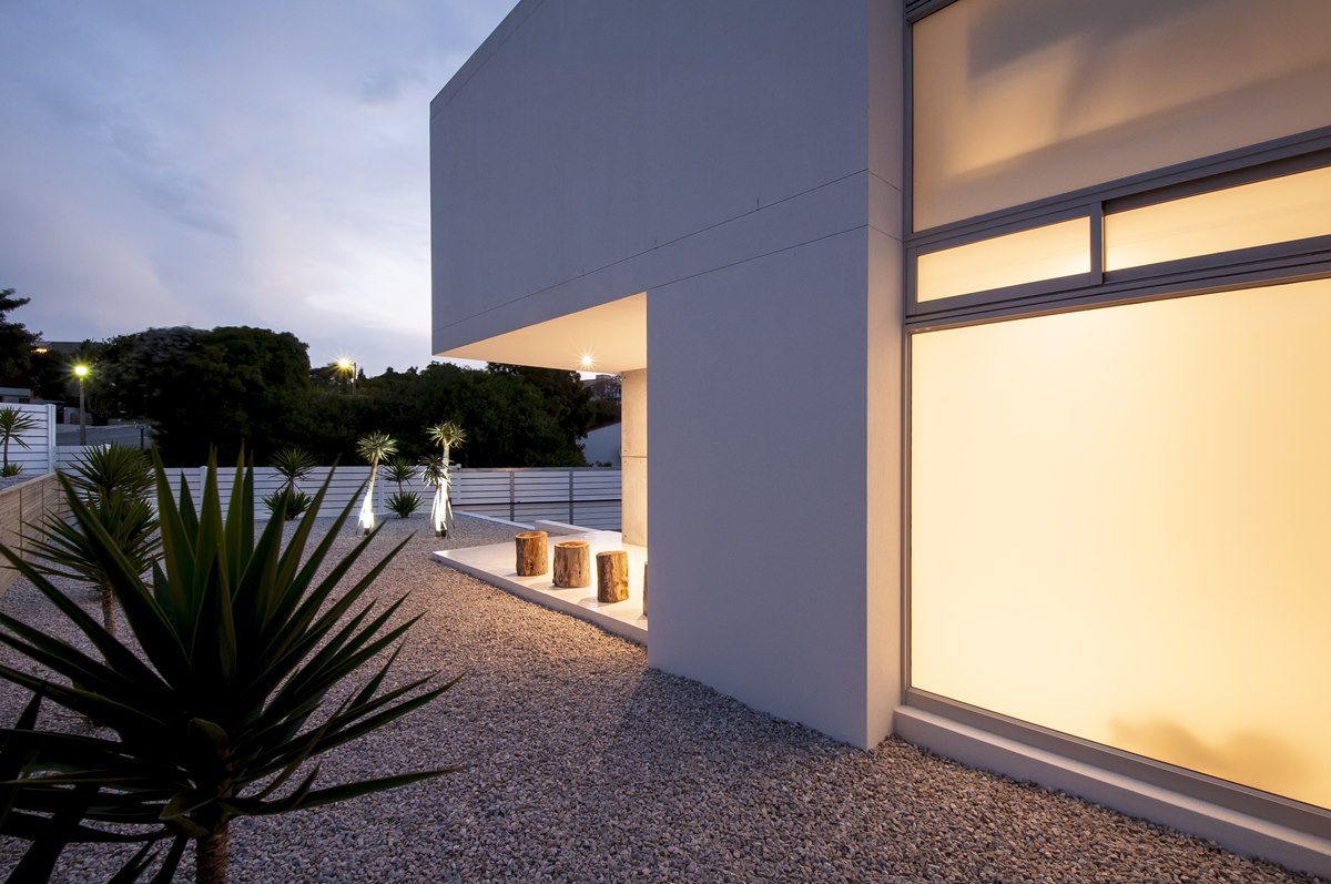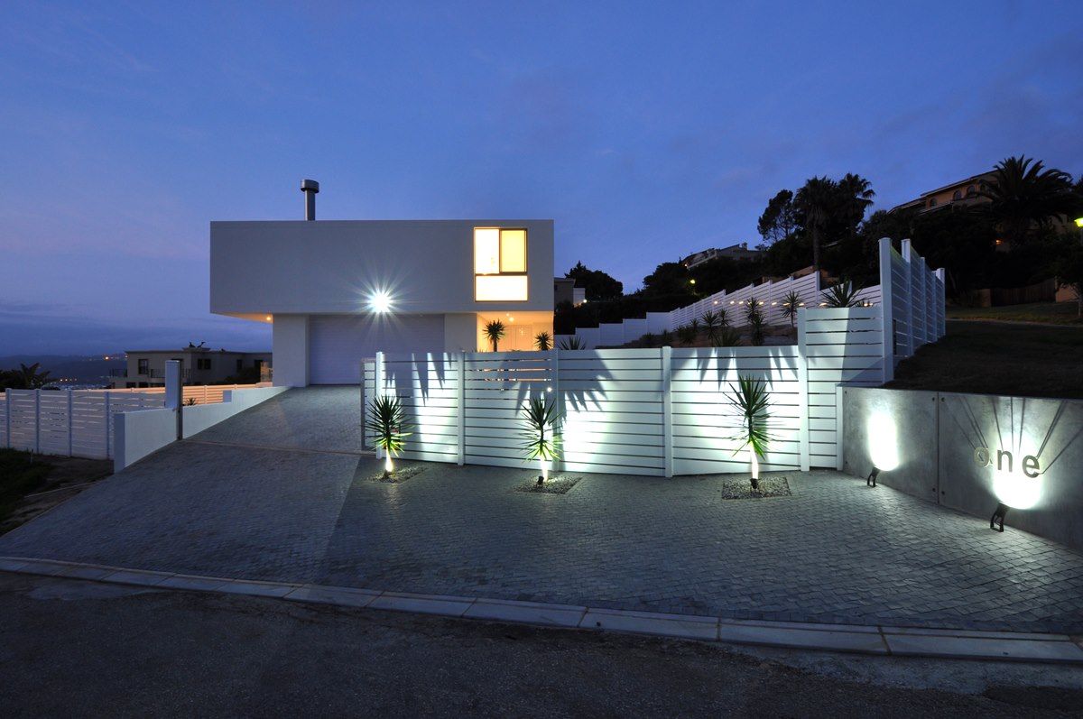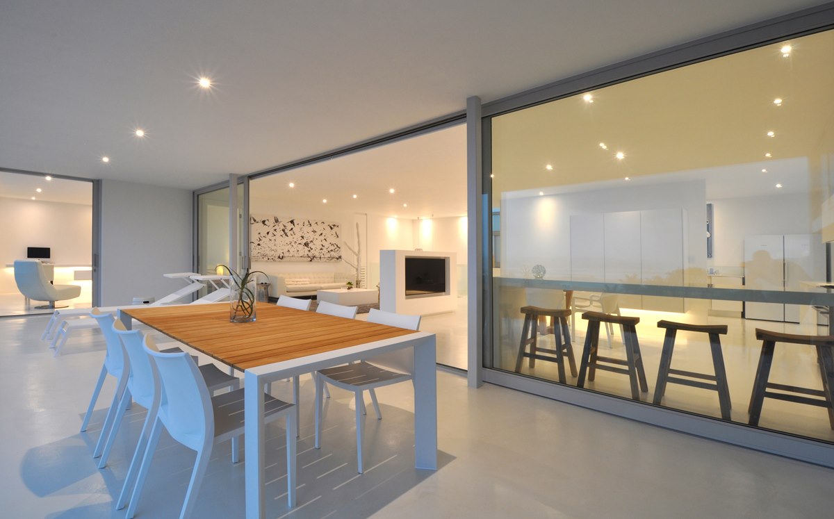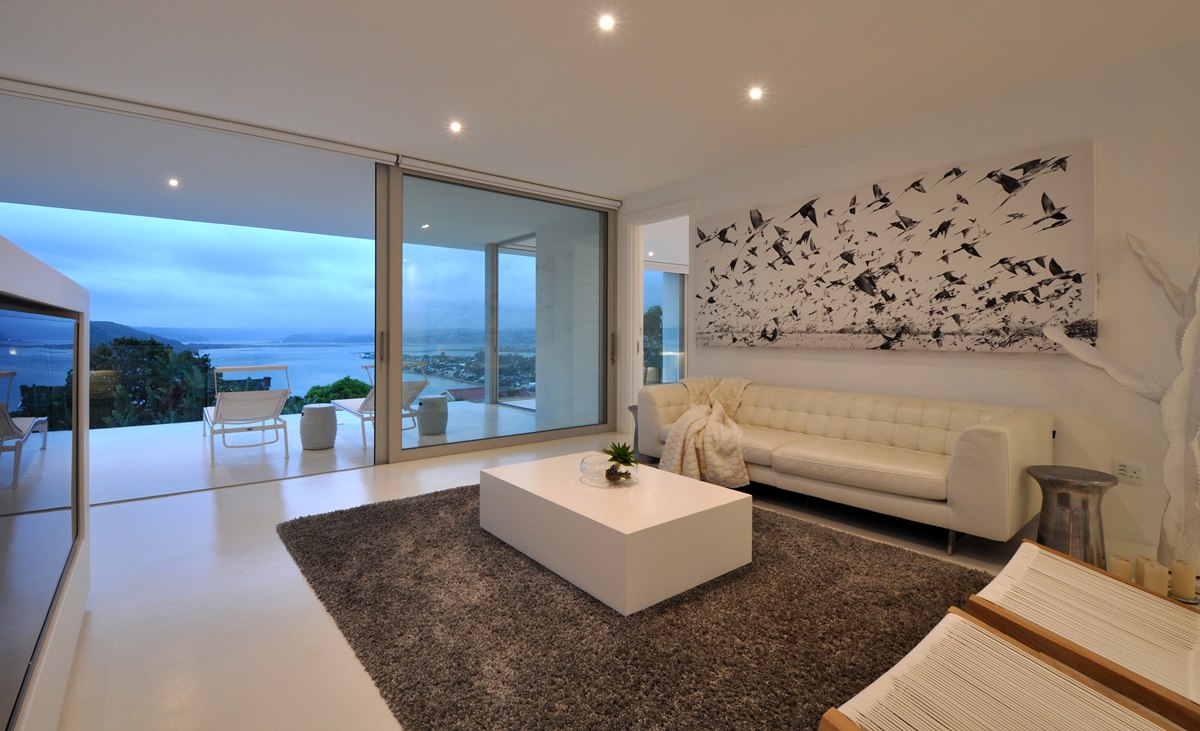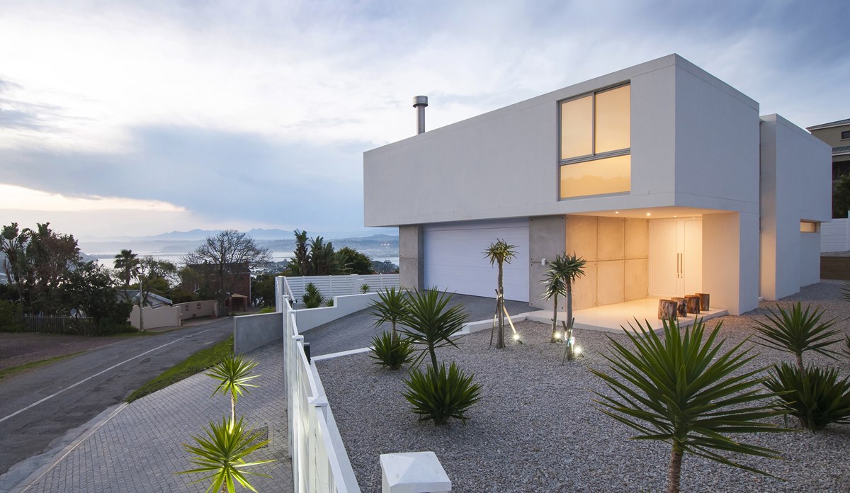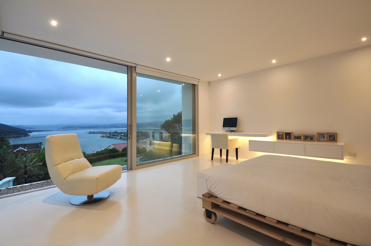 Facing the Knysna Lagoon, with the views of The East Head and the distant town, the house takes on the form of a sleek cube. Within it lies the living spaces, entertainment areas, and the master bedroom, creating a penthouse experience for the couple.